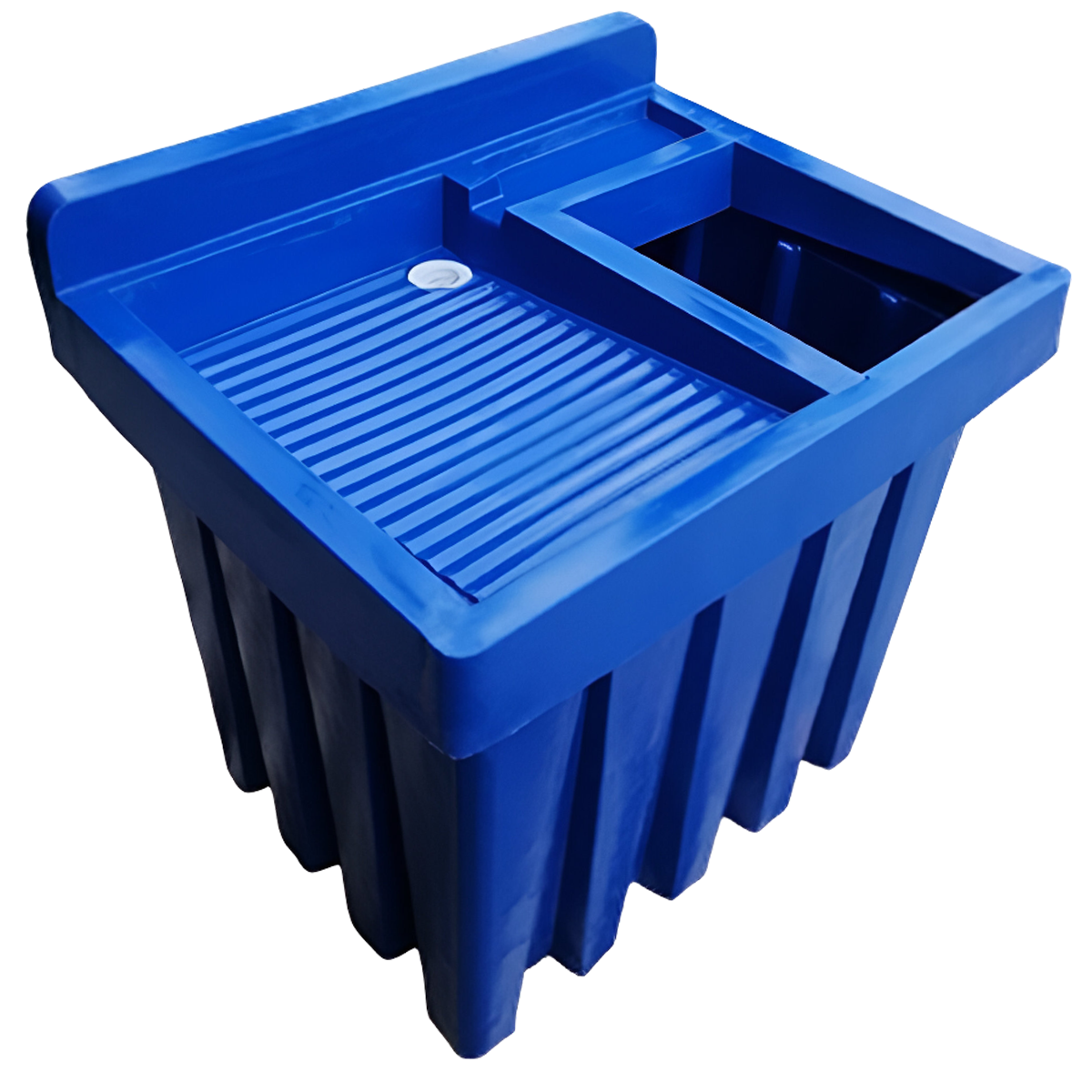 El Lavamanos lavadero portátil es liviano, fácil de instalar y de reubicar, tiene capacidad de almacenamiento de agua de 250 litros, incluye tapón de fregadero, tapón de tanque y tubo de 2” de desagüe, No incluye otros accesorios ni griferías, útil en zonas de limpieza de industrias, obras, hogar, agropecuario, jardines y zonas abiertas, es amigable con el medio ambiente, ya que el 30% del material es recuperado de los procesos postindustriales y al final de su vida útil puede ser reciclado.